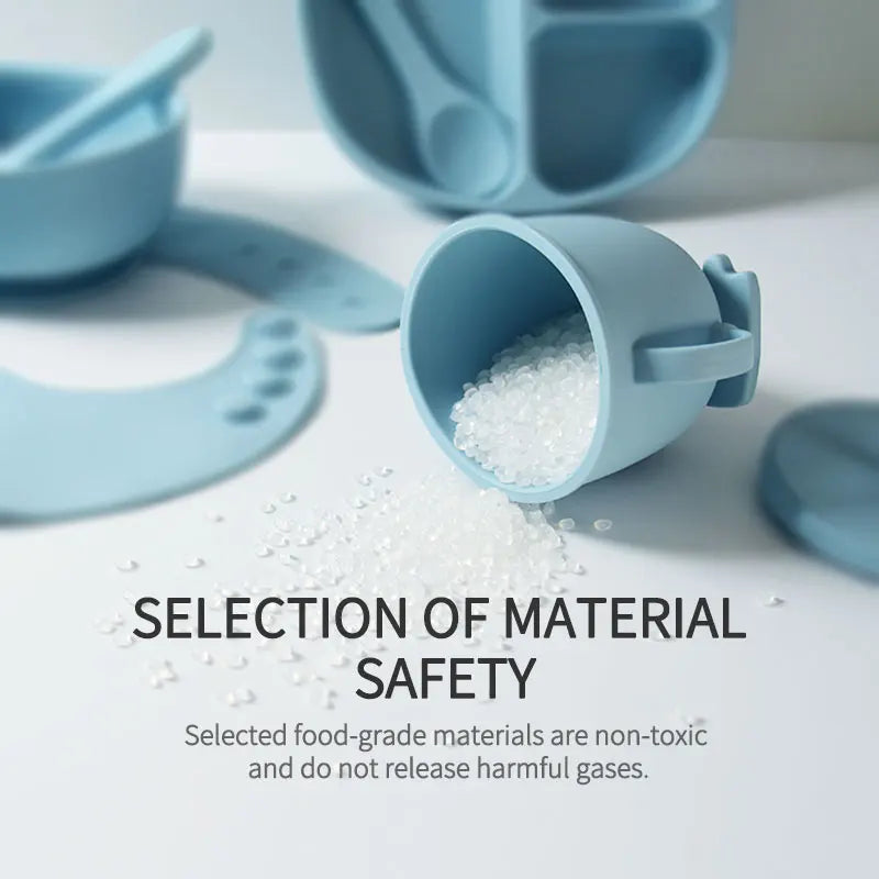 Set completo di 5 pezzi in silicone per neonati. Include ciotola, bavaglino, tazza, forchetta, cucchiaio e piatto. Tutto il necessario per l'alimentazione del tuo bambino in un unico set. Materiale sicuro e facile da pulire. Perfetto per lo svezzamento e per insegnare al bambino a mangiare da solo.